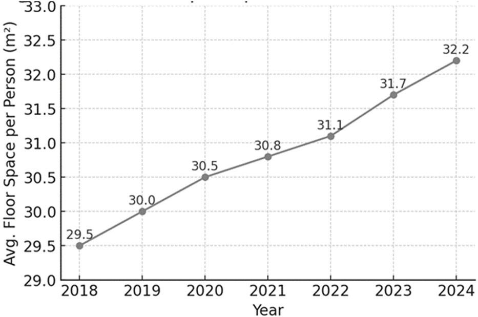 Several factors contribute to this growth. Economic improvements, including rising household incomes and stable employment rates, have enabled more individuals and families to afford larger homes or undertake renovations that increase usable living space. The observed trend also reflects broader social and economic policies aimed at supporting housing development, such as government incentives for residential construction and urban revitalization projects. Furthermore, the growing emphasis on quality of life and well-being has influenced housing preferences, with more people seeking environments that offer sufficient space for work, leisure, and family life, a need that became especially pronounced during and after the COVID-19 pandemic. This upward trend could also be associated with the growing demand for more spacious homes, especially in urban areas, as well as the effects of economic factors like rising wages and low unemployment.