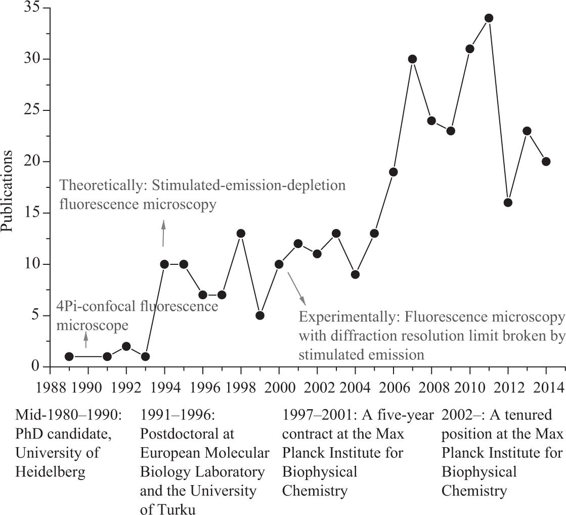 In 1994, Hell published the theory of STED in Optics Letters (Hell & Wichmann, 1994). But Abbe’s rule was still looming large. Many physicists were resistant to Hell’s ideas and focused on other imaging methods. Despite this, in 1997, Hell was offered a five-year contract at the Max Planck Institute for Biophysical Chemistry to demonstrate that STED works. In 1999, he sent the resulting manuscript to Nature and Science, but was rejected. In 2000, PNAS published the data, in which STED was used to produce the first truly nanoscale fluorescence images (Klar et al., 2000), and Hell obtained a tenured position at the Institute in 2002, where he continued to develop and apply new imaging methods.
