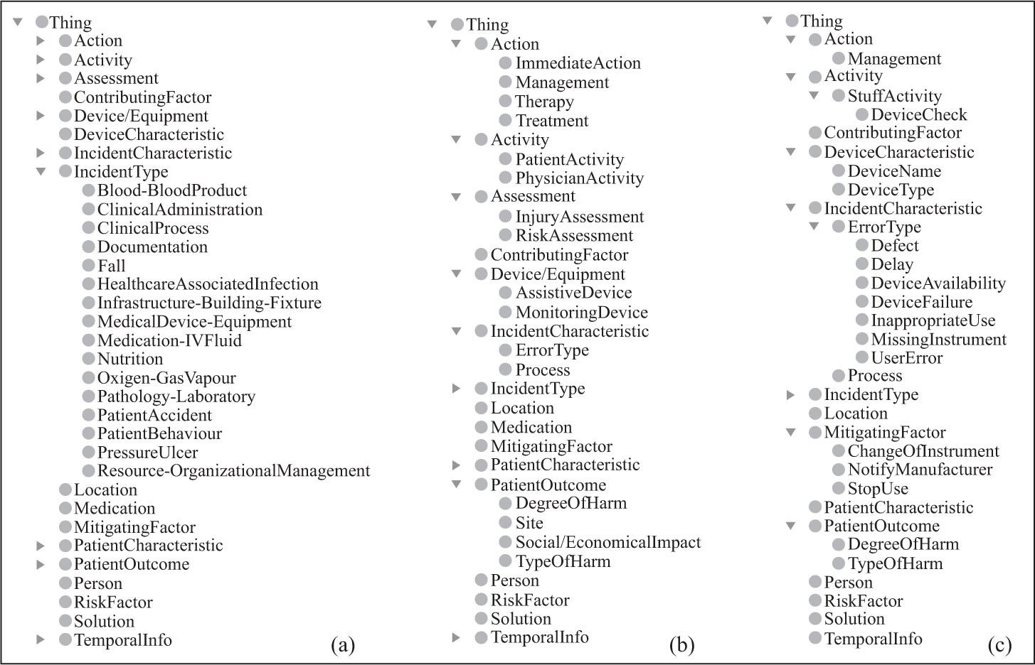 Protégé screenshots of partial ontology hierarchies. (a) Overall ontology structure. (b) Ontology structure of the classes associated with ‘fall’ incidents. (c) Ontology structure of the classes associated with ‘equipment and device’ incidents.