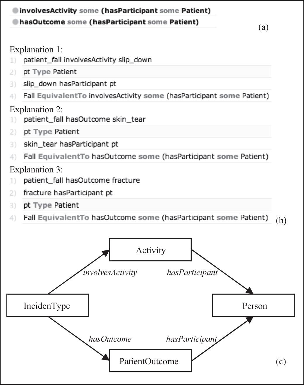 An example of inferred terms. (a) Two rules that infer a ‘patient fall’ incident. (b) Three inferences suggested by HermiT 1.3.8 in Protégé. ‘Patientfall’ is inferred as an instance of ‘Fall’. (c) A diagram of designed logical path applied in the example.