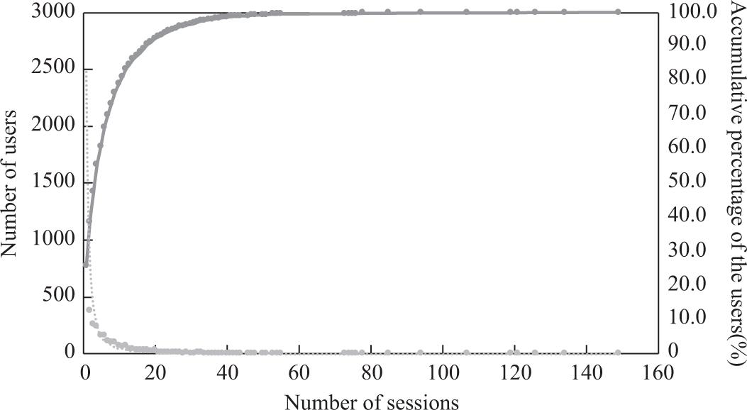 The log data contains click-through activities of both consumers and shop owners, but we are only interested in the search and browsing activities of consumers. Since shop owners tend to be a lot more active in making purchases than average consumers, we removed users who had too many sessions as belonging to businesses. Figure 2 shows the distribution of the users by the number of sessions.