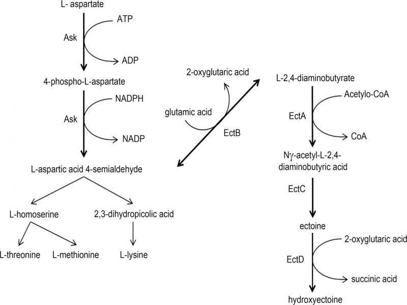 Ectoine producers known in the literature are also methanotrophic microorganisms. Current literature reports concern mainly halotolerant methanotrophs, i.e.: Methylomicrobium alcaliphilum 20Z, M. kenyense, M. buryatense [23, 50, 51]. Reshetnikov together with colleagues distinguished two types of gene organisation responsible for the synthesis of ectoine related to the tolerance of microorganisms to the salinity and the production of this osmolyte. Methylomicrobium marinus 7C and M. kenyense AMO1 strains have ectABC genes and accumulate ectoine in the amount up to 70 mg per g dry weight of bacteria. These bacteria are capable of growth in the presence of 4–5% NaCl [52, 76]. In the case of M. alcaliphilum 20Z strain, equipped with the ectABC-ask operon, the possibility of growth in higher salinity (up to 10% NaCl) and the accumulation of more ectoine (> 120 mg/gdw have been found). Which means that the specific aspartic kinase plays an important role in the synthesis of ectoine [76]. The conversion of aspartate to β-aspartyl phosphate by aspartate kinase (Ask) is the starting point in the biosynthesis of aspartate family amino acids and ectoine. Khmelenina et al. demonstrated that the halotolerant strain M. alcaliphilum 20Z, isolated from the alkaline lake of Tuva in Russia, in the presence of 6% NaCl, produces osmolytes such as: ectoine, sucrose and 5-oxo-1-proline respectively at the level of 739–1021, 175–401 and 426–560 nmol/mgdw depending on the concentration and form of nitrogen in the substrate [50].