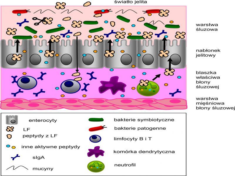 Pokazano schematyczny przekrój przez błonę śluzową jelita. Komórki nabłonka (enterocyty) wytwarzają laktoferynę, która uwolniona do światła jelita niszczy drobnoustroje patogenne, stymulując jednocześnie wzrost i chroniąc bakterie symbiotyczne. W stanie zdrowia niewielka ilość LF jest też uwalniania przez nieliczne neutrofile naciekające blaszkę właściwą błony śluzowej. Egzogenna LF (dostarczona z pokarmem) jest rozkładana do peptydów przez enzymy trawienne lub pochodzenia bakteryjnego; część z peptydów działa w świetle jelita na patogeny i symbionty, a część przechodzi do blaszki właściwej, gdzie może regulować komórki odpornościowe. Inne elementy ochronne jelita: bariera jelitowa (szczelny nabłonek jelitowy), sIgA, mucyny (śluz złożony z glikoprotein), inne białka przeciwdrobnoustrojowe (np. lizozym, defensyny, białko BPI), substancje bójcze wydzielane przez symbionty (np. KKT, bakteriocyny). Wszystkie te czynniki zapewniają eubiozę, czyli stan równowagi mikrobioty jelitowej, chroniąc przed dysbiozą, zakażeniem i zapaleniem.