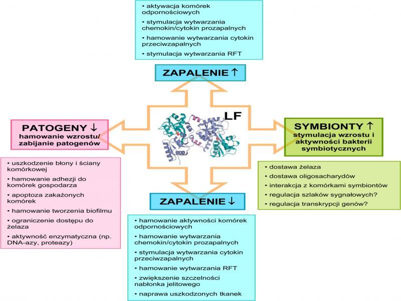 Laktoferyna na różne sposoby niszczy/hamuje wzrost drobnoustrojów patogennych, jednocześnie promując drobnoustroje symbiotyczne; w ten sposób normalizuje skład mikrobioty. Podczas wczesnego etapu infekcji LF jednocześnie mobilizuje układ immunologiczny do walki z zakażeniem (czyli czasowo nasila stan zapalny), a następnie wycisza jego aktywność (czyli wygasza stan zapalny). W ten wielokierunkowy sposób pomaga przywrócić stan równowagi mikrobiologicznej i immunologicznej, jednocześnie regenerując uszkodzone tkanki i chroniąc przed nawrotem infekcji; LF – cząsteczka laktoferyny, ? – działanie możliwe, ale na razie nie udowodnione.