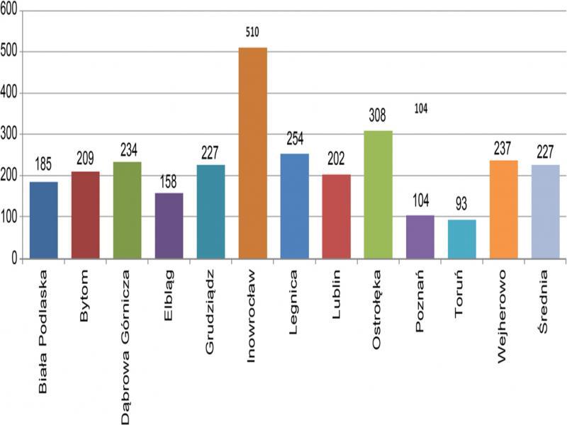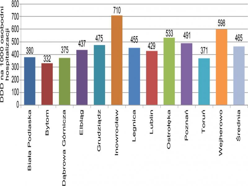 Rycina 2 przedstawia przykładowe roczne zużycie leków z grupy J01 wyrażone za pomocą DDD na 1000 osobodni hospitalizacji w wybranych szpitalach uczestniczących w sieci monitorowania zużycia środków przeciwdrobnoustrojowych. Dane z 2013 roku zgromadzono w ramach realizacji Narodowego Programu Ochrony Antybiotyków celem rozpoznania możliwości monitorowania zużycia antybiotyków na poziomie szpitala.