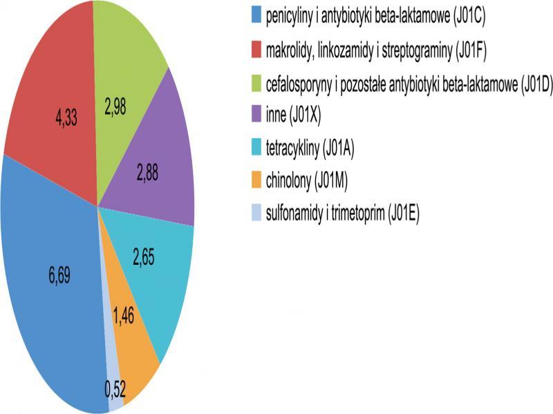 Przykład przedstawienia struktury zużycia leków: zużycie poszczególnych grup antybiotyków w Polsce w 2018 r. (DDD na 1000 mieszkańców na dzień)