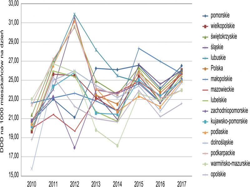 Przykład przedstawienia dynamiki zużycia leków: zużycie środków przeciwbakteryjnych (grupy J01) w poszczególnych województwach w Polsce w latach 2010–2017 (DDD na 1000 mieszkańców na dzień)
