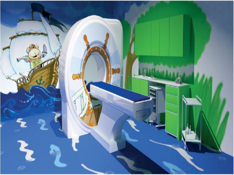 An attempt to create a fairy tale world-like space is undoubtedly the most popular concept in such projects. The idea of a complex office interior design includes the aesthetic combination of the building’s wall barriers with a dedicated medical device (Fig. 4). A tropical jungle, cosmos, safari, pirates and marine creatures are helpful inspirations. Magnetic resonances and tomographs produced by GE Healthcare are exemplary instances of medical devices designed with consideration for the sensitivity of the youngest patients. Doug Dietz, a medical device designer who had seen an 8-year-old patient’s fear of examination in a hospital, made a modification of the device he designed in order to adapt it for a child’s perception. The effect of the work has been favorably received by both children and medical staff. As a result, further series of magnetic resonances, tomographs and PETCT scanners, with a thematic arrangement called: Pirate Aventure, Coral City Adventure, Jungle Adventure were developed. The new graphic design of the devices has contributed to the reduction of anesthesia treatments’ number prior to advanced imaging diagnostics [12].