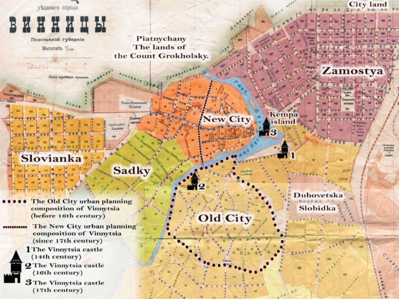 Each of the periods of the formation, development or decline of the urban environment is connected with the socio-political life of the region. The foundation of the Vinnytsia chronicle from 1363 is commonly associated with the princes Koriatovych and the attempt of the Grand Duchy of Lithuania to establish its dominance in Podillia. Until now, the exact location of the first Vinnytsia castle has not been accurately determined. According to the description of the city in the lustration of the Kyiv land in 1471 and to the revision of Vinnytsia Castle in 1545, it is known that there were two wooden castle fortifications on the left bank of the river Bog (now the Southern Bug river) around which the settlement “Old City” was formed. [1].