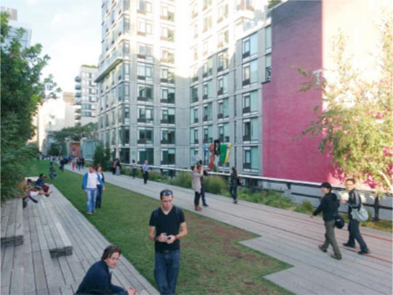 High Line, New York. Narrow belt of new public green space built on the unused railway viaduct, fitted between new and old buildings, became a catalyst for the neglected district’s development. Photo: A. Sas-Bojarska