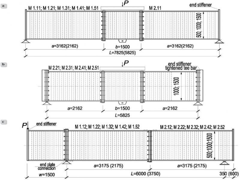 Girders with corrugated webs, from which samples used in investigations into strength properties of corrugated webs were collected: a) with a flexible end stiffener; b) with a rigid end stiffener; c) cantilever girders