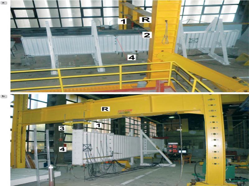 Girders were assembled from items (Fig. 2) prefabricated at the plant. The items of the girders were buttconnected using High Strength Friction Grip (HSFG) bolts. Girders were tested (Fig. 3) until ultimate resistance was reached, which resulted from the condition for web failure in the span or cantilever part of the girder. The load, considered as a concentrated force P, is transferred from frame (R) by means of the actuator (1) via a dynamometer (2) or a plate (3), to the end plate of the span or cantilever part of the girder (4).