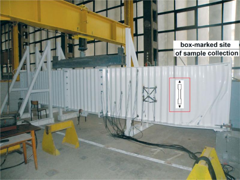 Six samples were collected from the web of each examined girder. The samples came from the areas with the lowest stress intensity level. In the first stage, the corrugated web part was cut out of undamaged area (box-marked in Fig. 4).