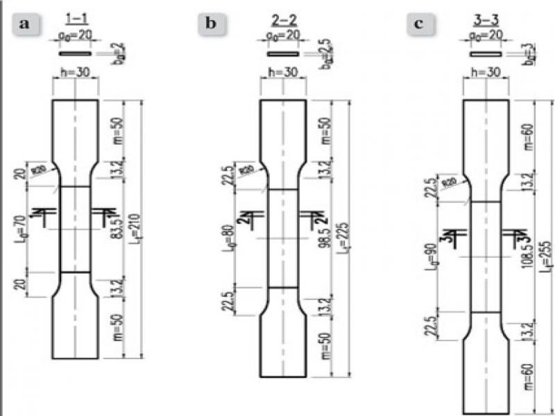 Dimensions of flat samples: a) sample from 2 mm thick web; b) sample from 2.5 mm thick web; c) sample from 3 mm thick web mm