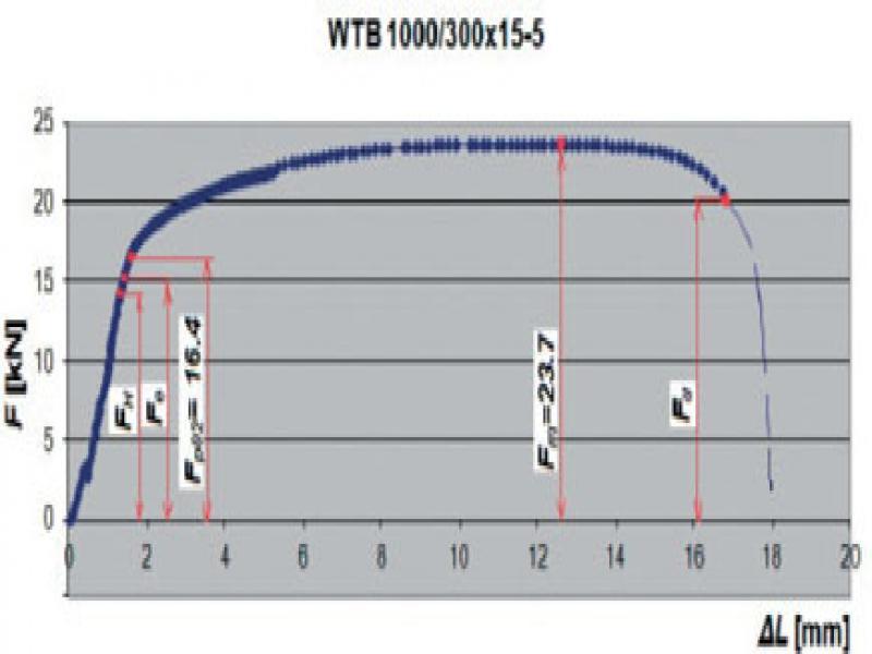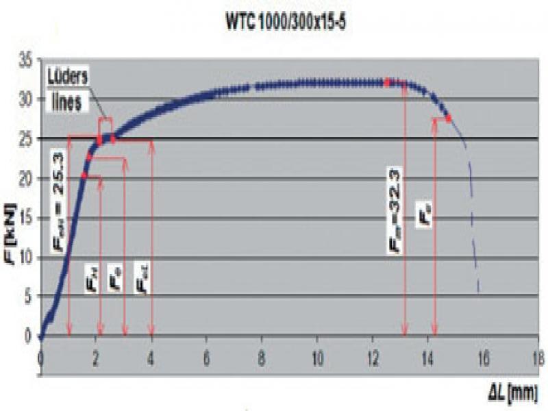 On the basis of investigations, graphs (Figs. 8 and 9) of the dependence F – ΔL and also – were plotted. In the graphs, the values of forces FeH and Fp 02 corresponding to yield strength Re and also the values of forces Fm corresponding to tensile strength Rm were marked. For a majority of samples, graphs clearly indicated plateau that specify the material’s yield strength. However, due to the corrugated web manufacturing process that involves folding and cold-rolling, the plastic flow zone represented by Lüders-Czernov’s lines was clearly short. A distinct difference between upper and lower yield strength was not observed (Fig. 8), which is advantageous for the bearing capacity of corrugated sheets.