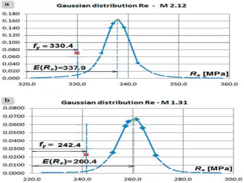 Figure 10 shows exemplary normal distributions of yield strength obtained for samples of corrugated webs of M 2.12 and M 1.31models. Mean E(Re) yield strength and design yield strength fy were marked (acc. formula (2) i.e.