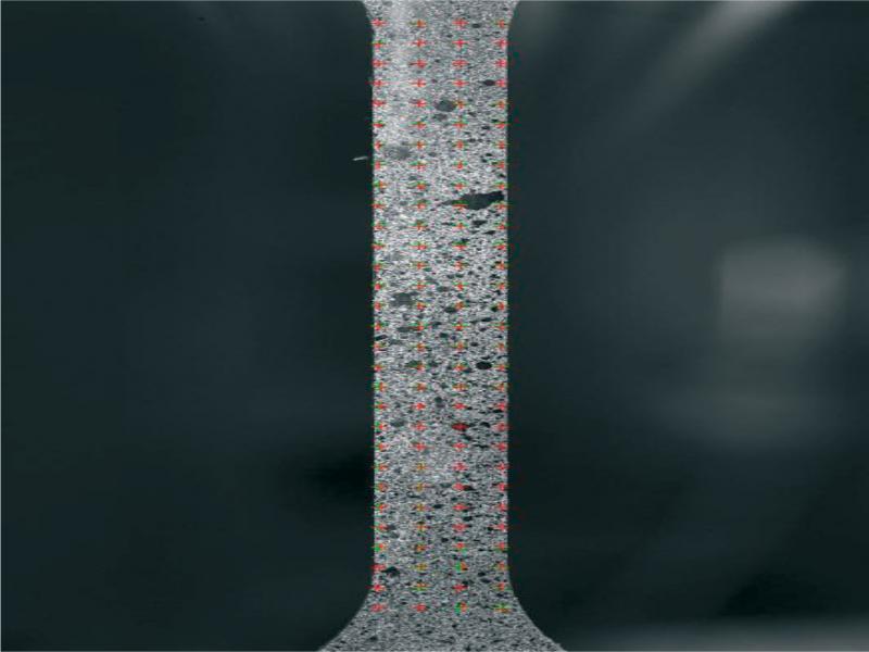 In addition, three tensile tests were carried out with the same type of specimen to determine Poisson’s ratio according to [17, 18]. The set-up is shown in Fig 3. To measure strains in the specimens, characteristic points (speckle pattern) were applied with black and white spray paint before testing, see Fig 4. Strains in two directions were measured with a high resolution camera and evaluated as changes in distances between the characteristic points. Then, Poisson’s ratio was calculated as a ratio of these strains. A zone in the central part of the narrowed specimens was chosen for averaging the results. The tests were performed at the speed of 1 mm/min as described in section 3.1. According to [17] Poisson’s ratio must be determined in the range of elastic strains, for a linear stress-strain relationship: 0.3%–εy. For the analysed adhesive this range was ~1.5–5%.