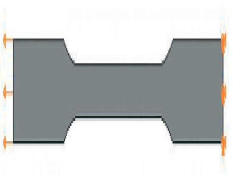 The diagrams shown in Fig 10. and 11. provide the distribution of engineer stresses and longitudinal deformations in the sample along the symmetry line. The different area of the cross-section of the sample close to supports and at the narrow part cause nonlinear stress profile. In addition, a local disturbance of stress at the zones where the specimen’s width decreases can be observed. Due to the simplified model of the material which do not include local discontinuities, further increase of stress causes plasticity in the whole tapered part of the sample.