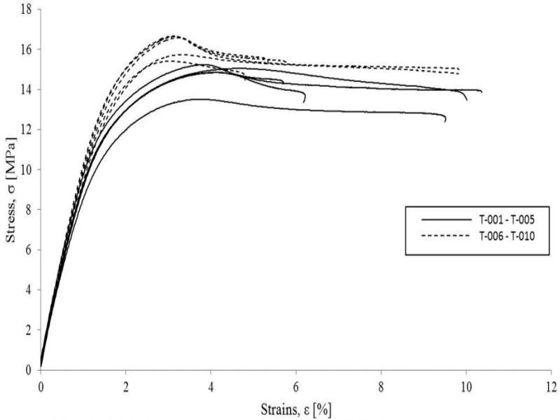 Tab. 2. and Fig 6. show the results of the experimental studies. Based on the stress-strain relationships (Fig 7.) obtained from the tensile tests the elastic modulus was calculated in the strain range of 0.05%-0.25%, according to [17]. Average tensile strength and ultimate strain of tested MMA samples at the speed of testing of 1 mm/min were 14.7 MPa and 4.11%, respectively. The corresponding modulus of elasticity was 1058 MPa. For the higher speed of testing at 10 mm/min, the values were 16.2 MPa, 6.81% and 1131 MPa, respectively. The observed differences of approximately 10% and 20% in tensile strength and stiffness clearly show the viscoelastic nature of the material.