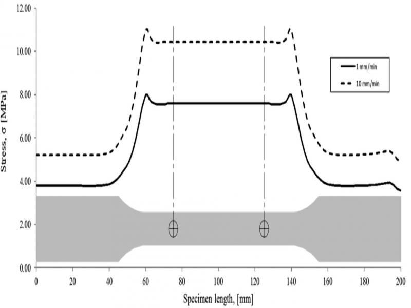 Strains calculated using extensometer measurements are a precise method because the section on which the displacements are measured is constant. The results obtained from displacements of the machine clamps and assumption of reference length of 115 mm coincide with the measurement of extensometer. Results compatibility was because the length of the tapered part of the sample in relation to the distance between the clamps was very large – 70%. If a smaller sample was analyzed, i.e. 5A according to [18], the results would probably not be so much convergent, as this ratio would be 50%. In the case of the assumption that the displacement of the machine measurement only refers to the length of the base 50 mm on tapered part of the specimen can lead to a significant overestimation of the strain values, which was confirmed by the analyzes. Designated for numerical analysis of specific points, such as the limit of elasticity and plasticity (summarized in Tab. 1.) have shown that, in the elastic range the secant modulus of elasticity is independent of the load rate. For speed of 1 mm/min it was 964 MPa and for 10 mm/min it was 957 MPa. Only when the stresses overcame the elastic limit, the results began to vary. For the design construction joints, different speed load increment should not significantly affect the stress distribution, provided that the analysis will be in the elastic range of adhesive.