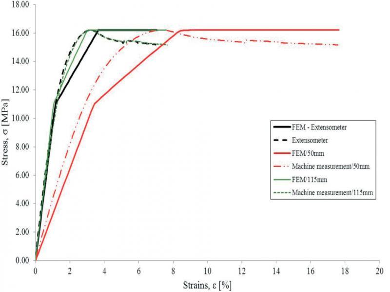 The strains obtained directly from the narrowed part of the sample (using extensometers) were compared with strains obtained cross-head displacement. The model of the material assumed simulates correctly the behaviour of the material in the state of pure tension as evidenced by the plots shown in Fig 12. There is also a noticeable difference in the results obtained depending on the strain measurement method. As can be seen, the strains obtained from extensometers (~7%) are much lower than values based on the cross-head displacement (~18%), as in the manufacturer's tests, where a 4.5-inch displacement of the clamps was referenced to a 1.5-inch tapered sample base. In turn, the results obtained for a base length of 115 mm (~8%) slightly deviate from the results from extensometers.
