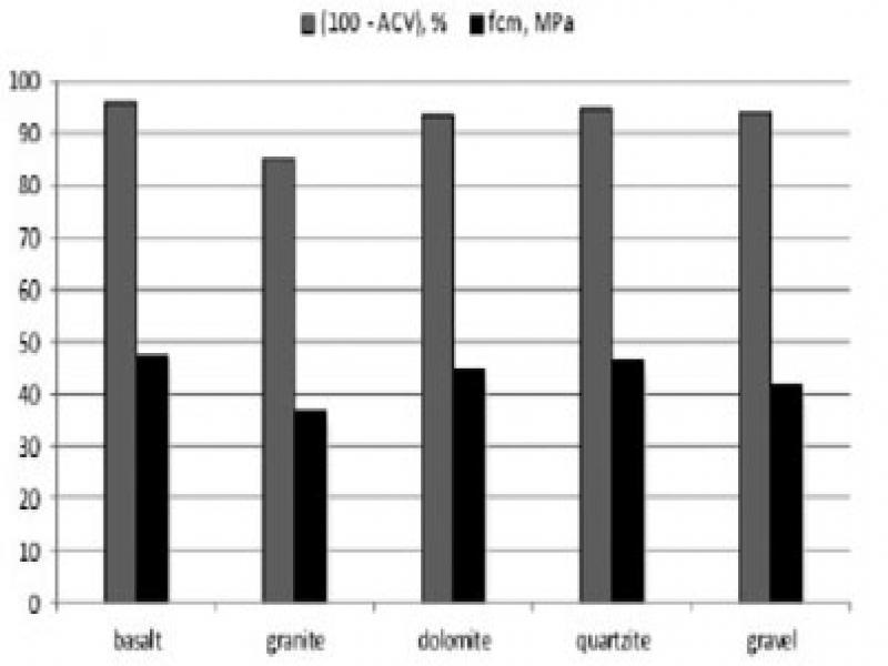 The best properties of concretes with basalt and dolomite aggregates are associated with aggregate-paste bond strength due to fine texture of basalt and tighter microstructure of cement paste-dolomite aggregate interfacial transition zone.