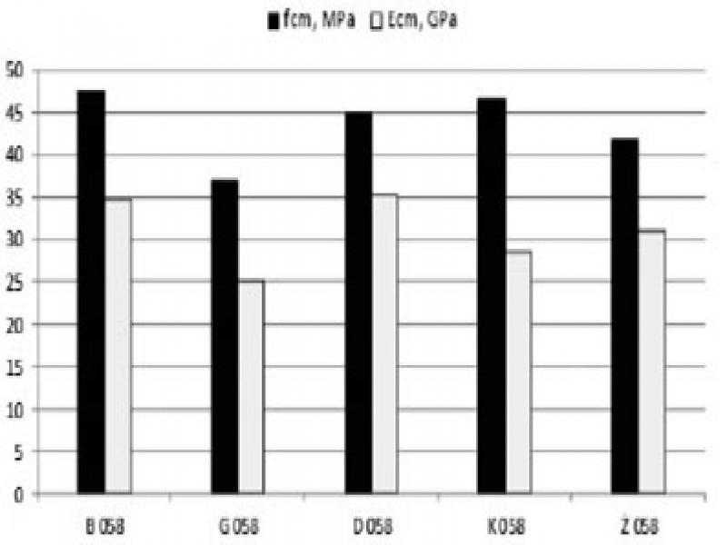 Relationship between compression strength values fcm and elasticity modulus Ecm of concrete