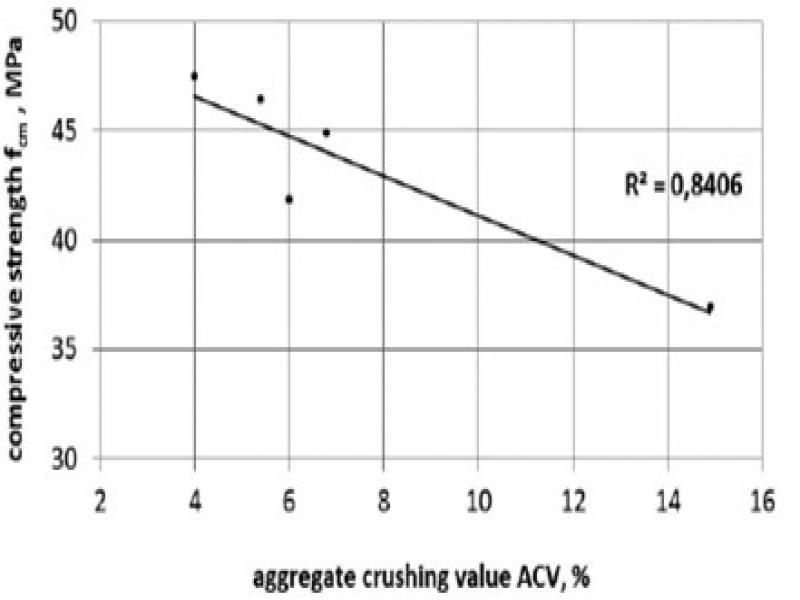 The concrete results were evaluated to identify the character and significance of compressive strength changes versus the aggregate crushing value. The elasticity modules of concrete with those aggregates were analysed with linear regression and correlation coefficients.