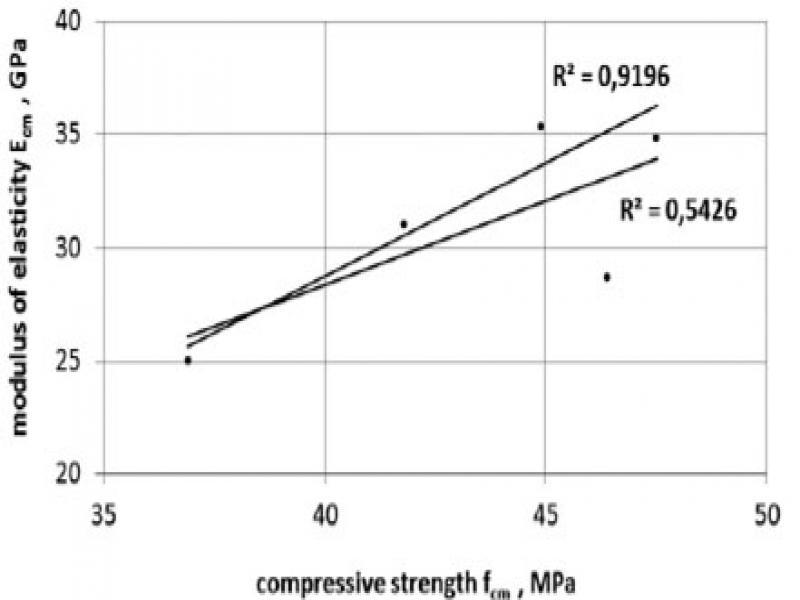 Regression straight lines for the dependence of elasticity modules on the compressive strength of all concretes tested (R2 = 0.5426) and concretes without taking into account the results of quartzite aggregate concrete (R2 = 0.9196)