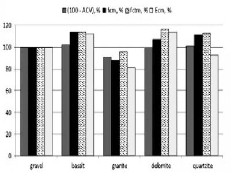Figure 10 compares the relative quantities of uncrushed grains % (100 – ACV) under load (equivalent of crushing strength in test of ACV) of individual aggregates vs uncrushed gravel grains and relative strengths %fcm, %fctm and modulus %Ecm of individual concretes vs corresponding properties of gravel concrete. The properties associated with gravel aggregate and gravel concrete were taken as the reference (100%), similarly as in the standard modules of concretes with different aggregates [24]. Aggregates have comparable crushing strengths, with the exception to granite. The ACV of this aggregate qualified it to the lowest class. The properties of dolomite and basalt aggregate of and concretes with them were the best. In addition to concrete with granite, the strength of concretes with crushed aggregates was higher from 10.0% to nearly 20.0% compared to concrete with gravel. Only modulus of concretes with basalt and dolomite is higher than that of concrete with gravel.
