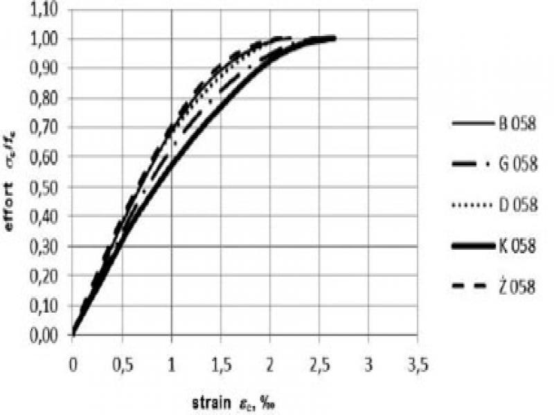 Large angles of experimental stress strain curves equivalent with high elasticity modules of concretes with dolomite and basalt aggregates, as well as concrete with natural gravel, are consistent with high elasticity modules and low limit strains of these concretes. Despite of high strength, concrete with quartzite sandstone aggregate has a low elasticity modulus and a very high limit strain. Strain properties of concrete with granite aggregate are even worse. In addition to low strength (two classes lower than other concretes with crushed aggregates) one can clearly see in the figure that inclination angle of the σc-εc curve is much smaller, this proves a very low elasticity modulus of concrete with granite aggregate.