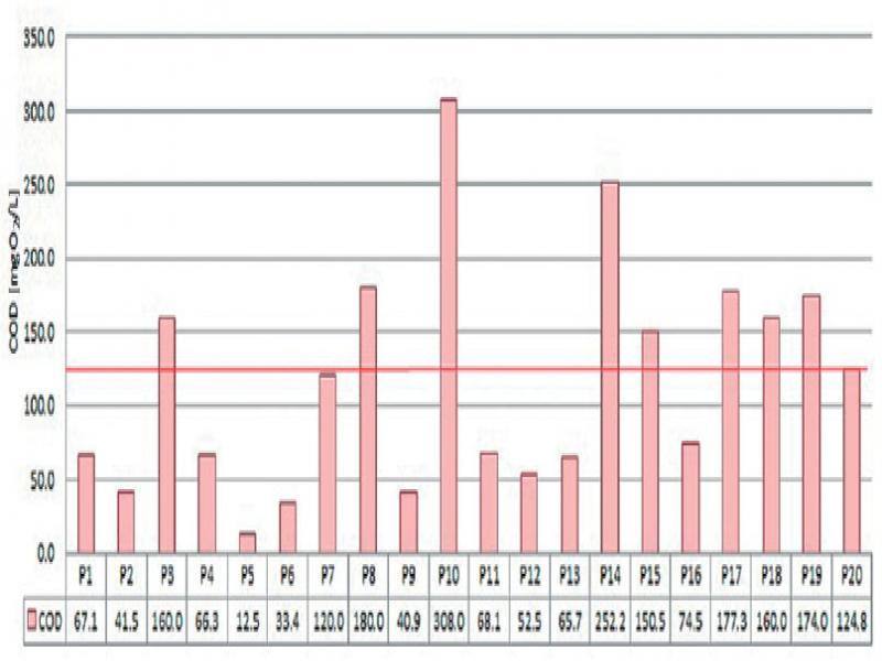 The quality analysis showed that any raw washings from the 20 studied objects could not be directly managed because the measured pollution indicators exceeded the limit values (Table 2). Fig. 1–5 present the values of selected pollutants in comparison to the permissible values according to the Polish Regulation on conditions to be met when introducing wastewater into watercourses or into the ground [15].