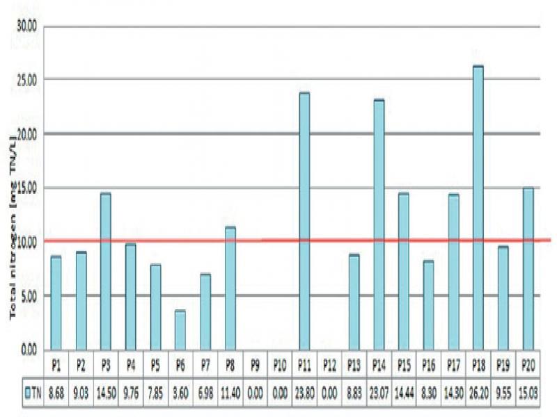 | Total nitrogen (TN) | [mg TN/L] | 8.68 | 9.03 | 14.50 | 9.76 | 7.85 | 3.60 | 6.98 | 11.40 | - | - | 23.80 | - | 8.83 | 23.07 | 14.44 | 8.30 | 14.30 | 26.20 | 9.55 | 15.03 | 10.00 |