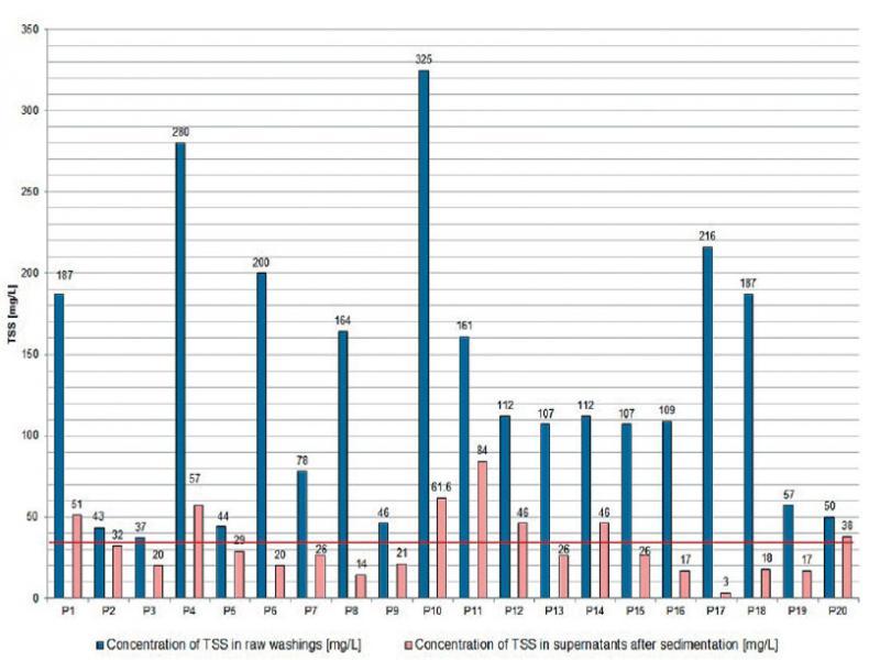 Comparison of TSS content in raw washings and after sedimentation in supernatants