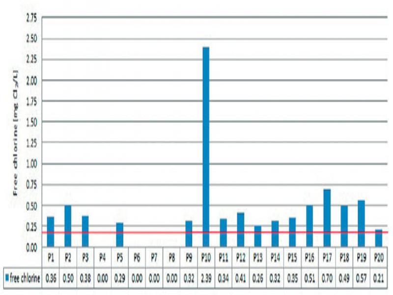 | Free chlorine | [mg Cl2/L] | 0.36 | 0.50 | 0.38 | 0.00 | 0.29 | 0.02* | 0.05* | 0.04* | 0.32 | 2.39 | 0.34 | 0.41 | 0.26 | 0.32 | 0.35 | 0.51 | 0.70 | 0.49 | 0.57 | 0.21 | 0.20 |
