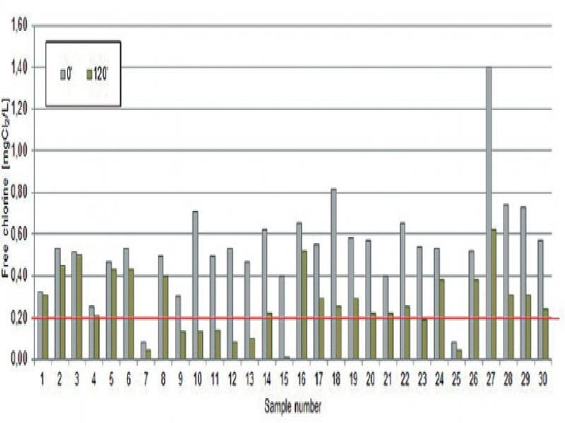 Concentration of free chlorine in raw samples and supernatant after two-hour sedimentation