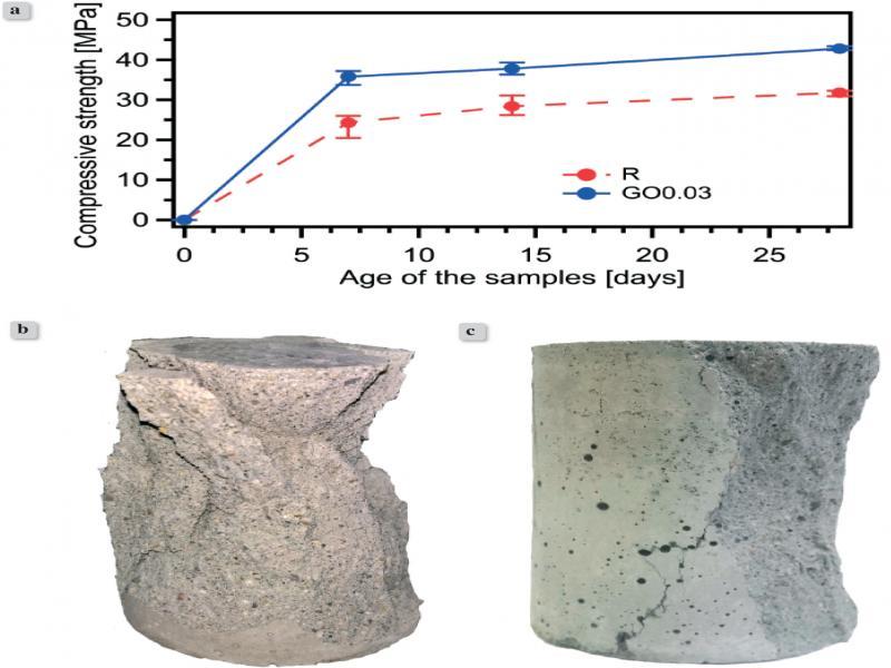 Interestingly, further comparison of reference mortar and mortar with GO has revealed that these two types of mortar differ also visibly in the forms of damage of compressed cylindrical samples. In particular, the unique influence of GO addition was highly visible in samples cured for 7 days. The complete damage of reference mortar occurred rapidly in these specimens, while cracking and loosing of cement-GO mortar occurred only on sides of the samples showing the typical cone shape of damage. After 14 and 28 days of mortar hardening, the cone shape of damage is clearly noticeable in both cement mortar samples (Fig. 2b and c), yet the incorporation of GO has resulted in less rapid damage of the specimens.