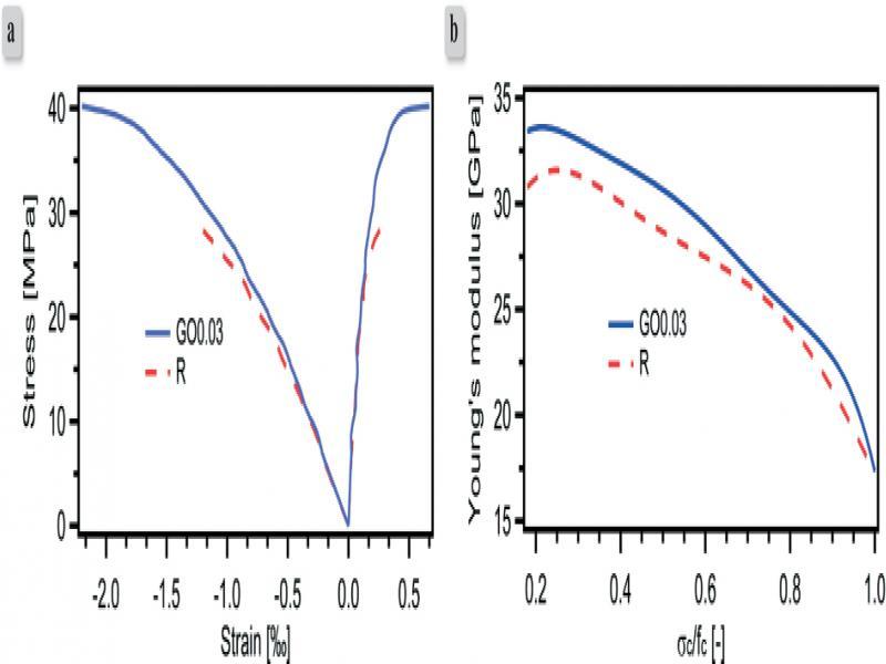 The studies on the variability of cylindrical compressive strength in time were followed by tests in the uniaxial stress state using cylindrical samples with the height twice their width, that was 60×120 mm. In this case, the average compressive strength at the age of 28 days is improved by 28% (Tab. 4). Moreover, on the basis of strain gauges’ measurements (Fig. 3a), the Young’s modulus was determined for both types of cement mortar. The same trend in Young’s modulus variability under increasing load can be observed for both mortars (Fig. 3b). However, the values for cement-GO mortar are slightly higher than those for reference mortar achieving the increase of 6% for the Young’s modulus calculated according to PN-EN 1992-1-1:2008 as a secant value between zero stress and stress equal to 40% of the average compressive strength (see Tab. 4).