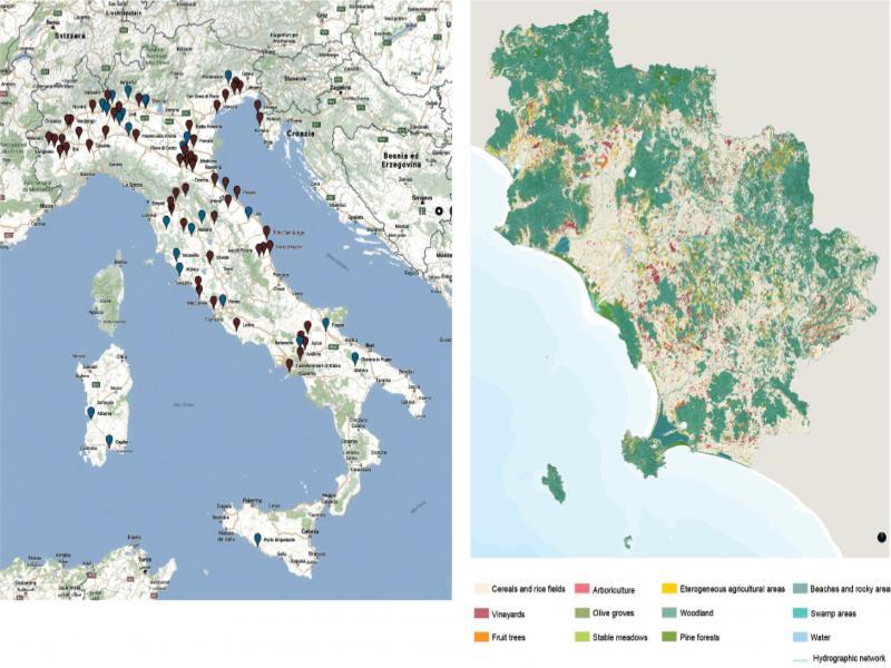 (L) Mapping of the Italian grain silos [1]; (R) Case study: silo of Grosseto. Territorial analysis [32, translation by S. Landi]