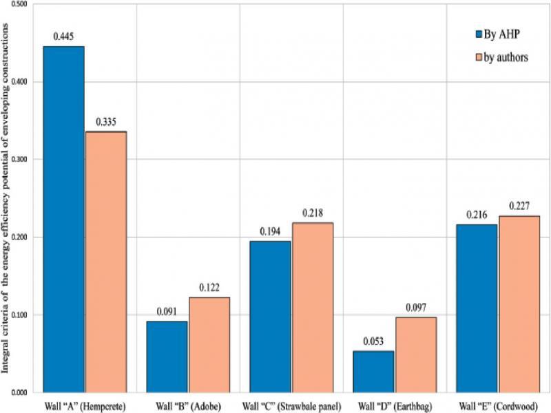 From Fig. 5 it can be concluded that the hempcrete envelope is the most effective wall type (coefficient of 0.445 for AHP and 0.335 for authors), the strawbale panels wall and cordwood one can also be acceptable from the standpoint of the energy efficiency potential criterion. They have respectively 0.216 for AHP and 0.227 by the authors for the cordwood wall, and 0.194 and 0.218 for the wall made of strawbale panels.