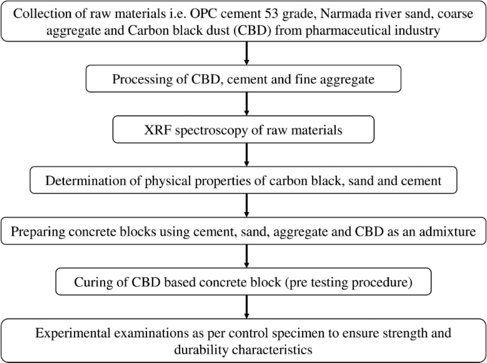 From the above discussion, a very detailed literature review was carried out and it was revealed that carbon black can successfully contribute to an improvement in the properties of conventional concrete mix. Thus, the main aim of the current work was to use CBD, a waste collected from pharmaceutical industry as an additive admixture by weight of OPC 53 grade cement in concrete mixtures of various percentages.