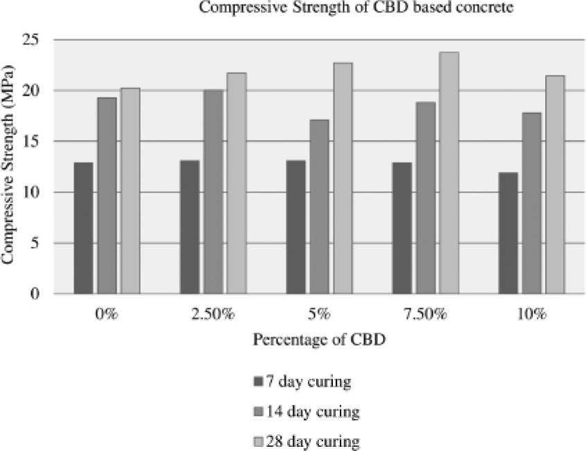 The observations were obtained from compressive strength test on the specimens having various percentage of CBD, tested after 28 days of curing and the results are as follows: