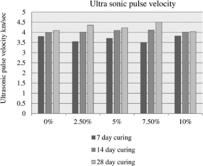 The concrete cube prepared using 10% CBD also formed good quality of concrete, but it was slightly less than the control specimen. The graphical representation for ultrasonic pulse velocity of CBD based concrete is shown in Figure 5.