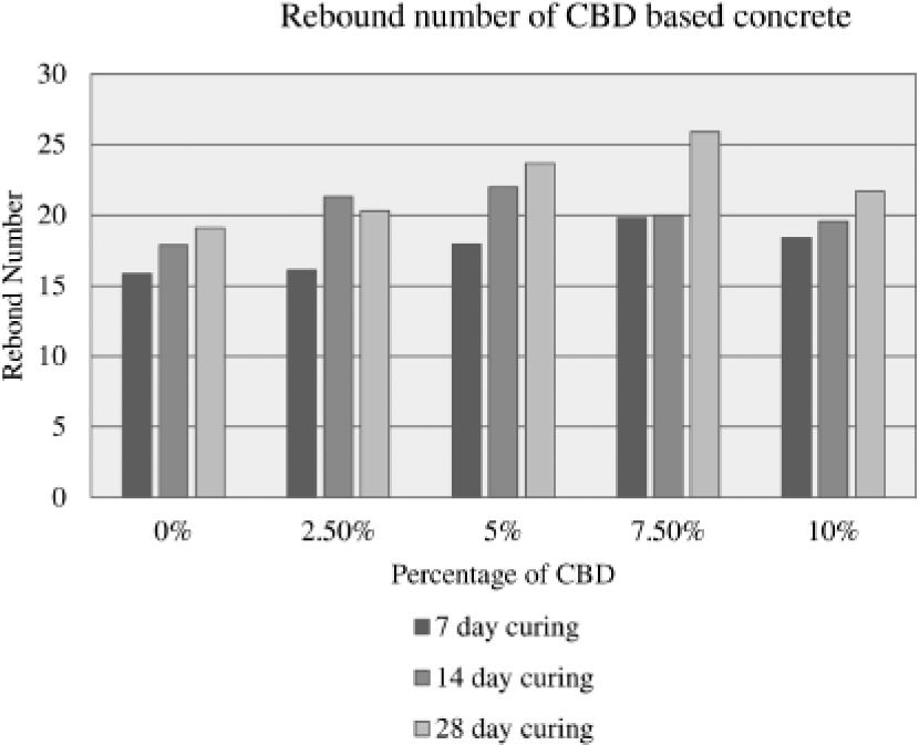 The results conclude that using CBD as admixture in concrete shows an increase in surface hardness, specimen containing 2.5%, 5%, 7.5% CBD shows gradual increase in surface hardness. 10% shows increase in surface hardness compared to control specimen, but it was slightly less than 7.5%. Figure 6 shows the graphical representation for rebound number of CBD based concrete.