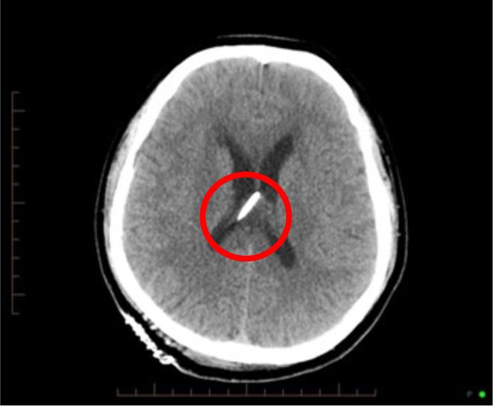 Pictured above is a scan of the patient’s brain. The white area circled in red shows the placement of the shunt following the first surgery.