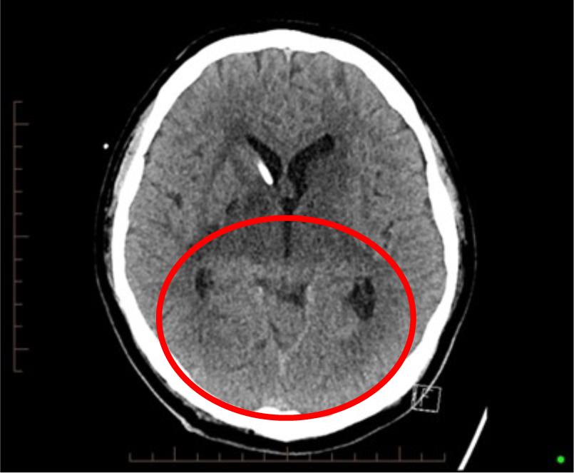 Pictured above is the result of the patient’s urgent CT head taken the morning that the patient passed away. It shows a large bilateral basal ganglia and thalamic infarct.