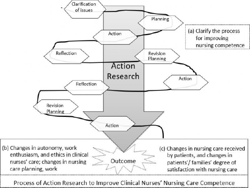 The aim of this research was to examine whether using a research process model (Figure 1) improves clinical nurses’ care competency by clarifying the following factors: (a) how clinical nurses in the neurosurgical ward changed and the process of improving nursing competence; (b) changes regarding clinical nurses’ patient care autonomy, work motivation, and ethics; (c) changes in nursing care (rate of medical restraint, rate of manual removal of faeces, etc.); and (d) changes in patients’ and families’ degree of nursing care satisfaction.