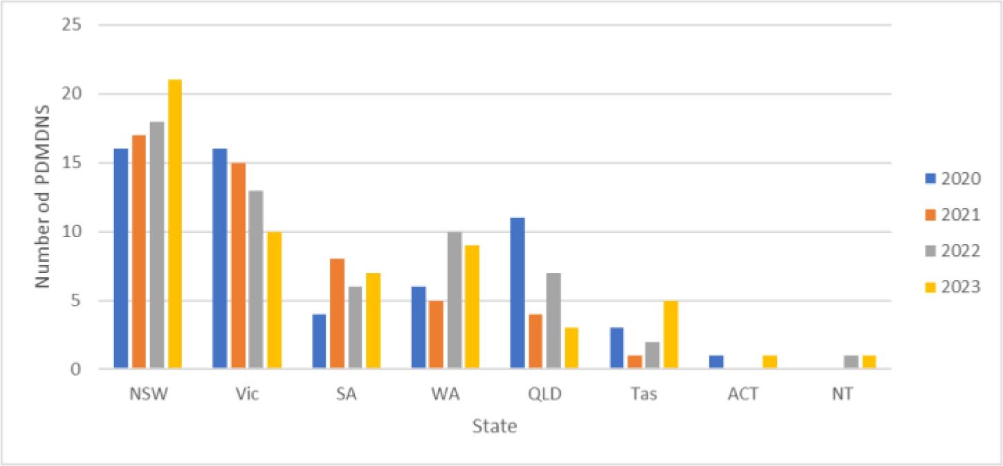 New South Wales (NSW) continues to be the highest employer of the PDMDNS in the country at 37% (n=21) followed by Victoria (VIC) at 18% (n=10). NSW has had the highest growth, increasing from 16 PDMDNS positions reported in 2020 to 21 in 2023. South Australia (SA) increased from 4 in 2020 to 7 in 2023, Tasmania (TAS) increased from 3 in 2020 to 5 in 2023. Australian Capital Territory (ACT) (n=1) remains stable Victoria, and Queensland overall have had a reduction in the number of PDMDNS reported between 2020 and 2023, Victoria losing 6, 16 in 2020 and 10 in 2023, Queensland reports the biggest loss of 8 PDMDNS nurses, from 11 in 2020 to only 3 in 2023. Northern Territory continues to have one single respondent employed in the same position covering the whole state.