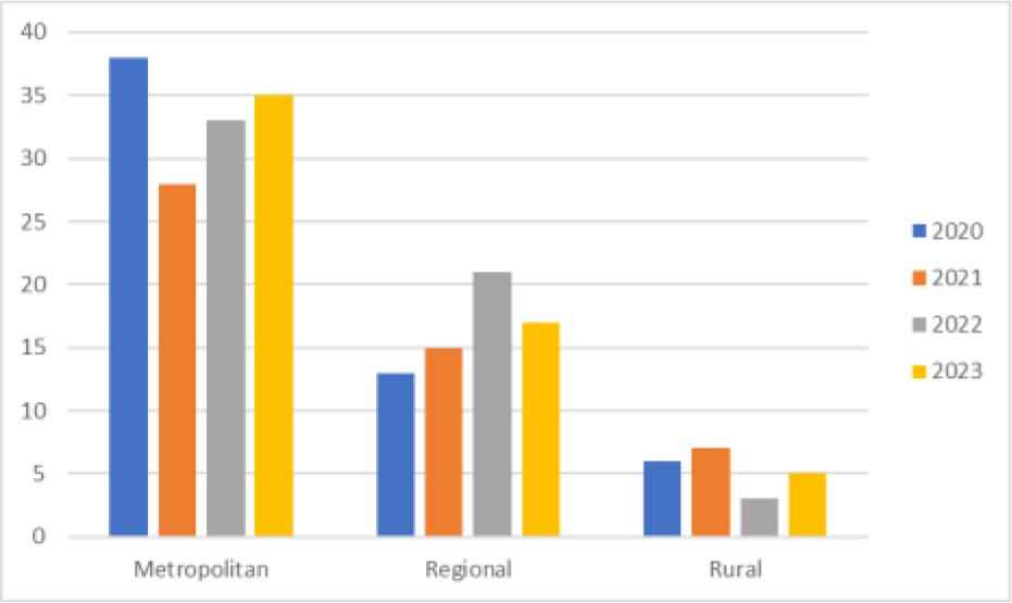 There has been a redistribution of PDMDNS positions with growth in the number of PDMDNS positions in the metropolitan and rural areas but a reduction of positions in the regional areas. In 2024 there were 35 metropolitan nurses increased from 28 in 2021, 17 regional nurses increased from 13 in 2020 but 4 less than 2022 and 5 rural PDMDNS increased from 3 in 2022 but holding relatively steady since 2020 (n=6).