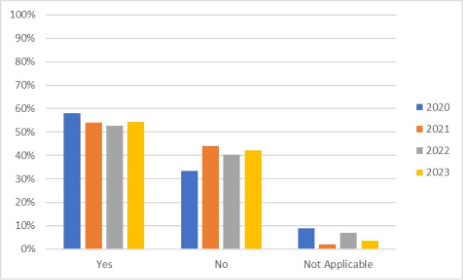 The reported permanency of funding for PDMDNS positions continues to be stagnant over the past 4 years with 54% of PDMDNS responding that their position has permanent funding and 42% continuing without permanent funding in 2023. The not applicable category include those employed on a contract basis for example.
